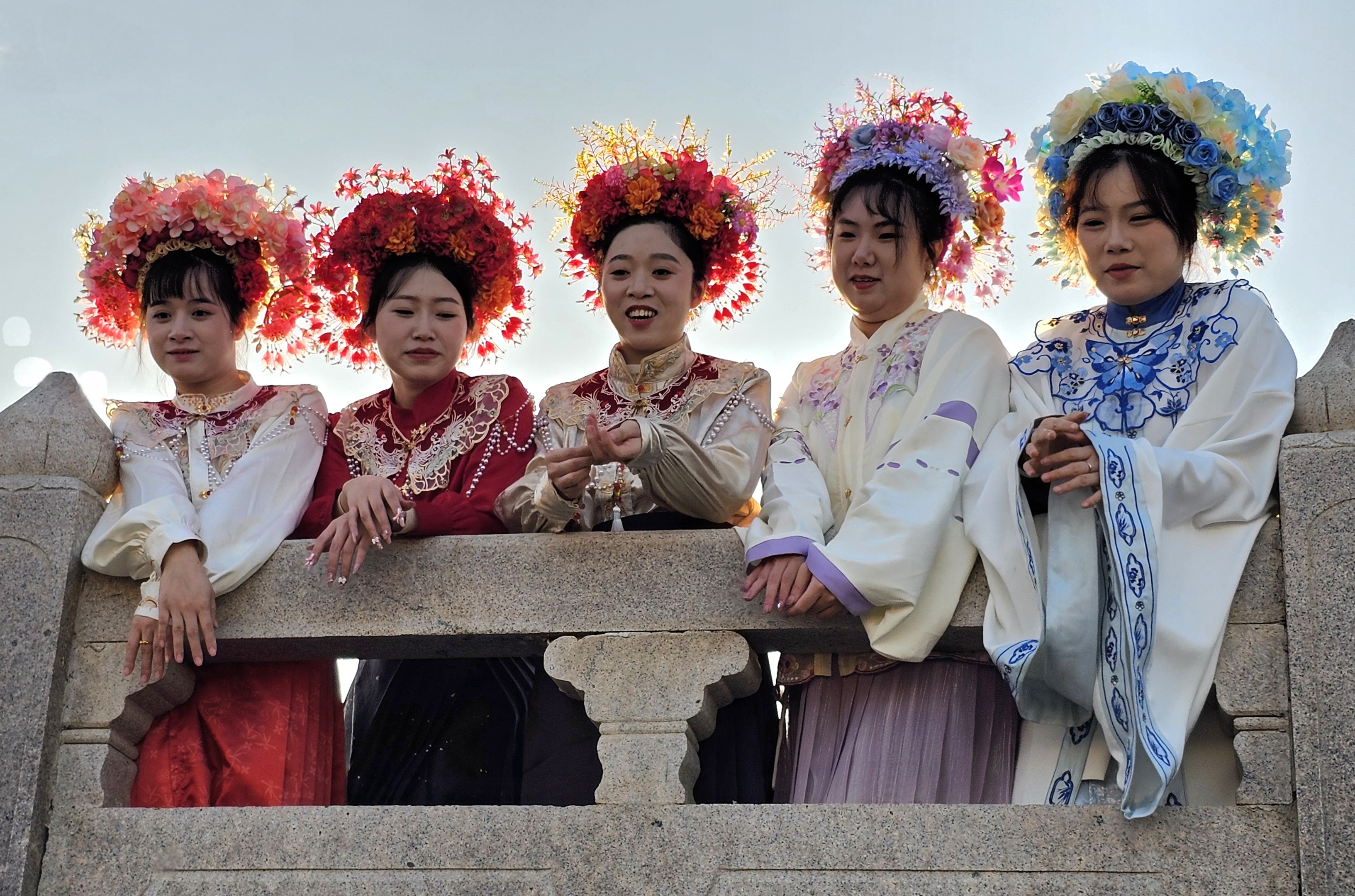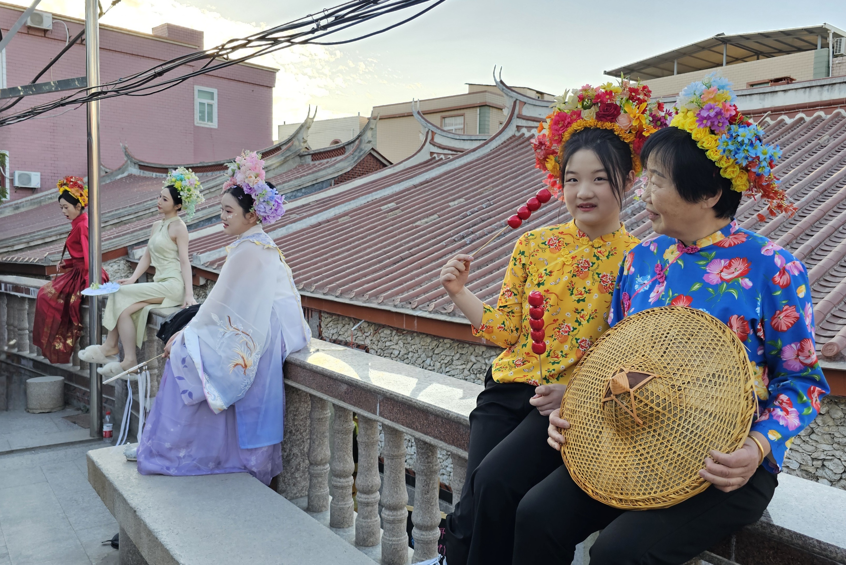In addition to the distinctive oyster shell buildings, you’ll also notice many women adorned with “Zanhuawei” (簪花围) – a floral headpiece that has become a hallmark of “Xunpu Women’s Customs.”